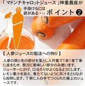 自然の恵みをたっぷりうけて育った神重農産の3代目がつくるにんじんをギュッと搾りました。水も一切使わず、原料は人参とレモン果汁のみ!