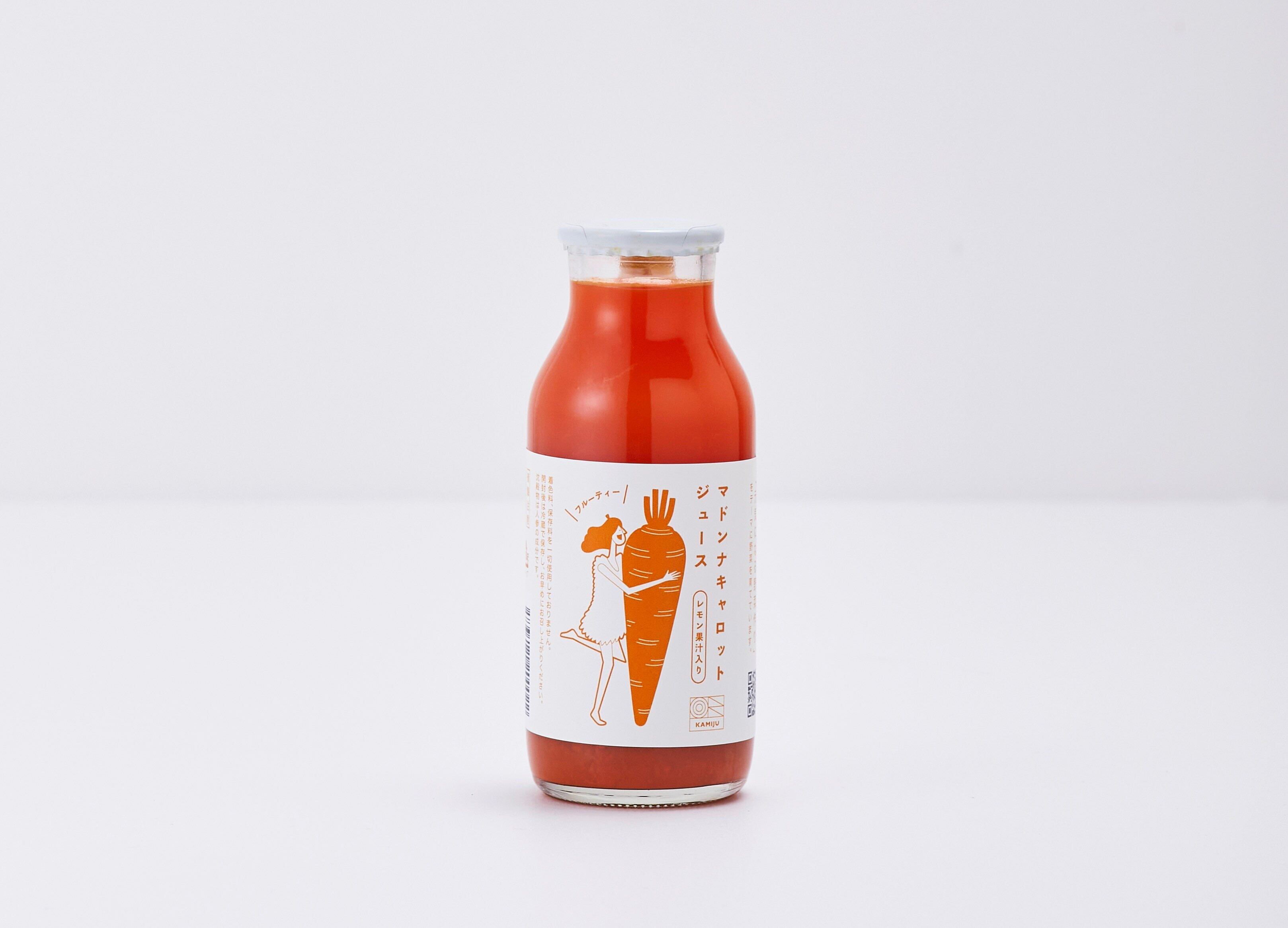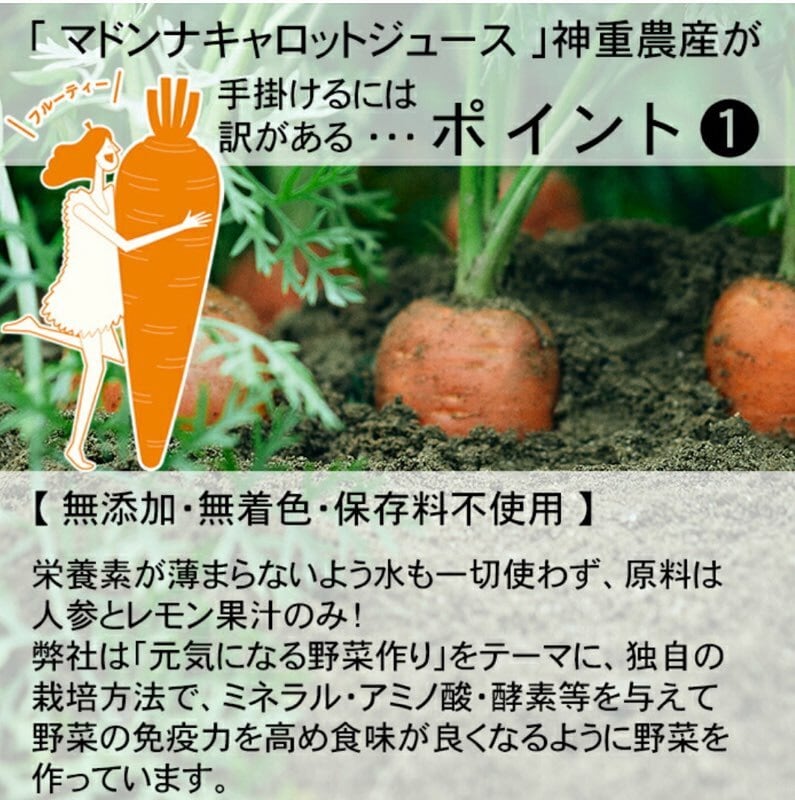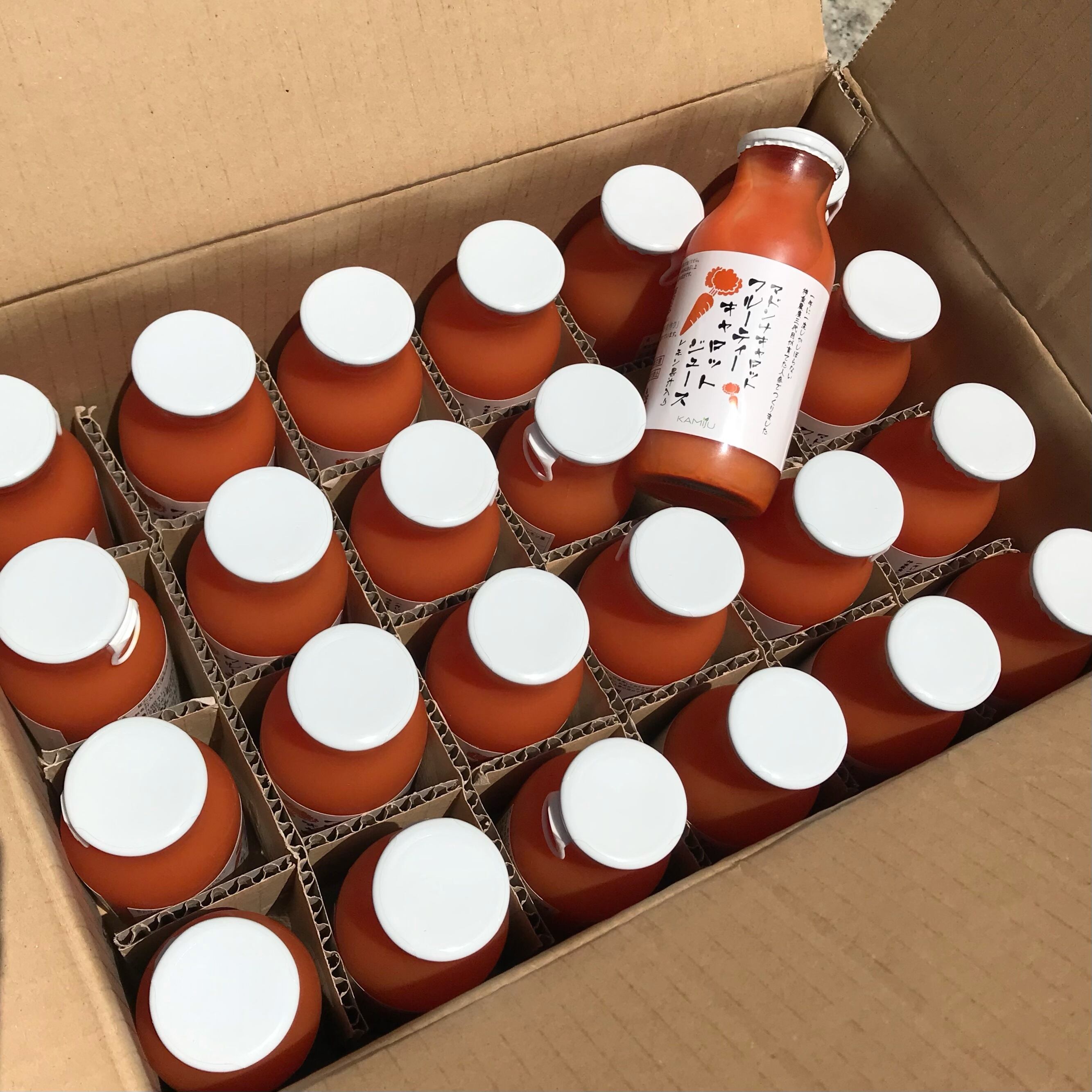自然の恵みをたっぷりうけて育った神重農産の3代目がつくるにんじんをギュッと搾りました。水も一切使わず、原料は人参とレモン果汁のみ!