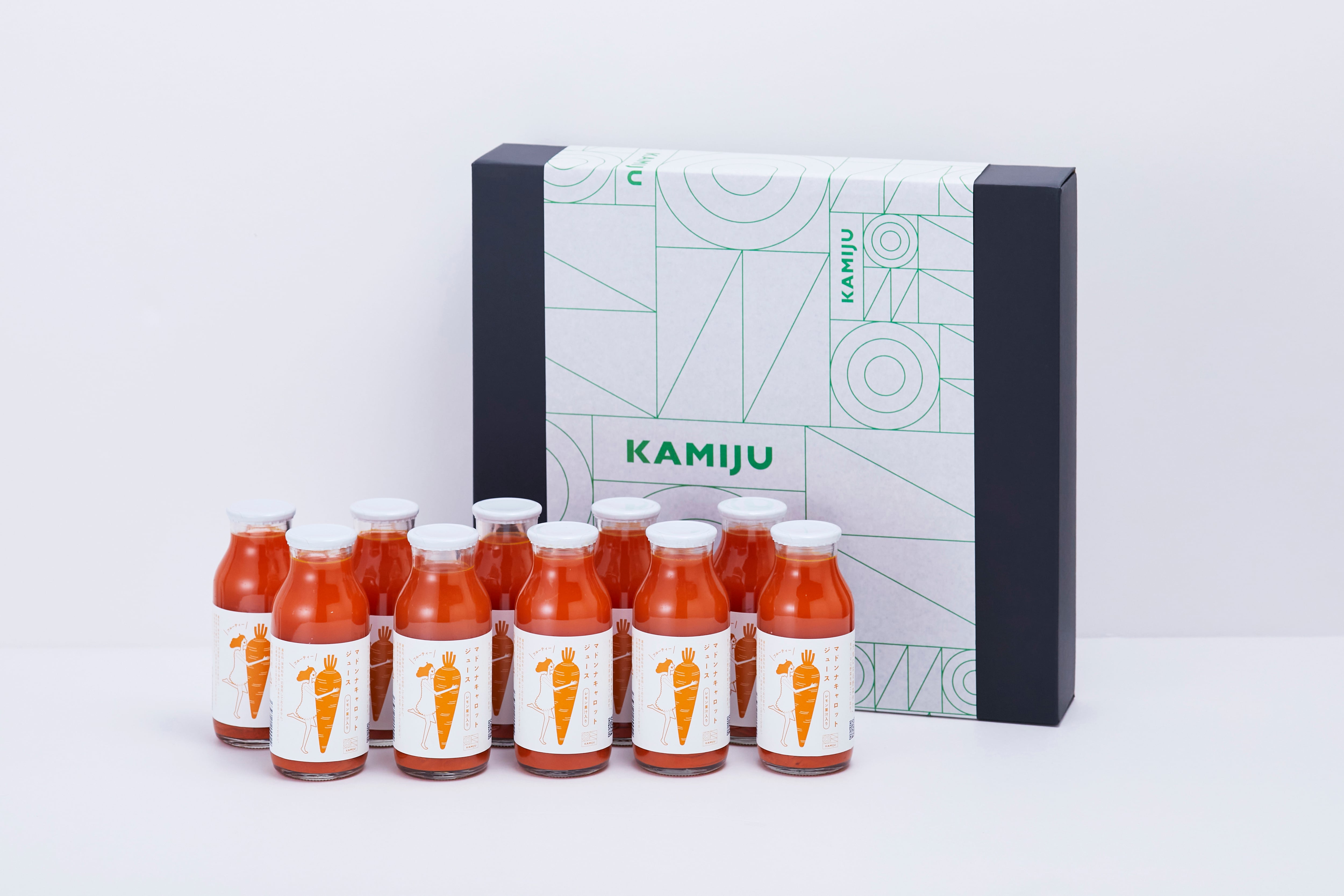 自然の恵みをたっぷりうけて育った神重農産の3代目がつくるにんじんをギュッと搾りました。水も一切使わず、原料は人参とレモン果汁のみ!