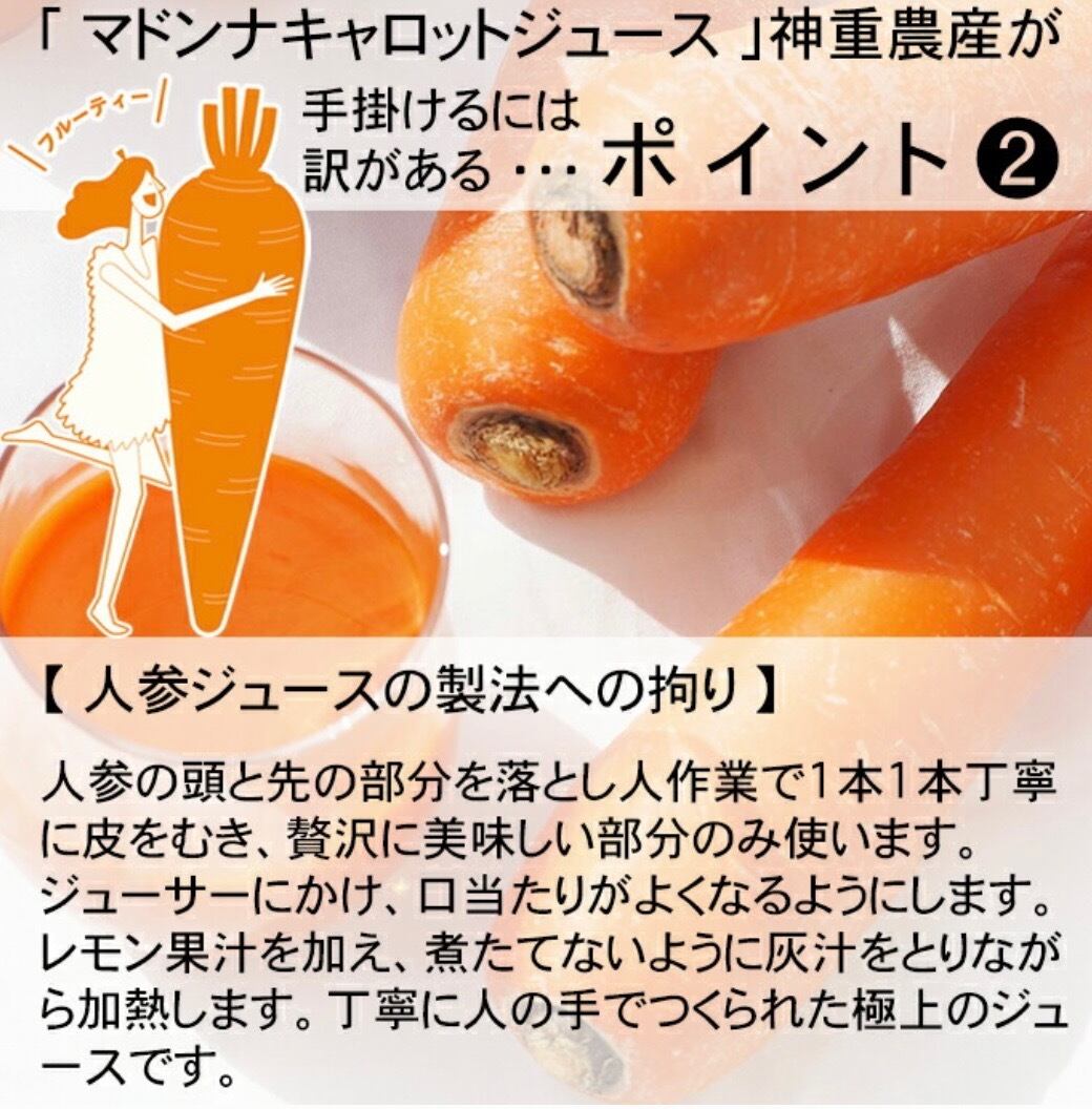 神重農産が育てる人参のなかでも、一年で一番甘みののる冬人参だけを使ってつくっています。